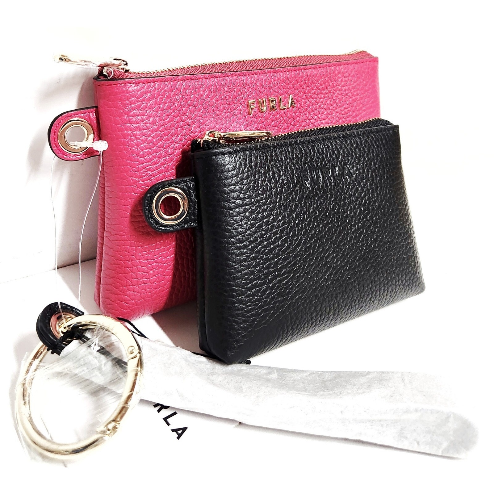 Furla Leather Two Piece Pouch Set with Keychain Strap • Nero Shock Pink • New with Tag!